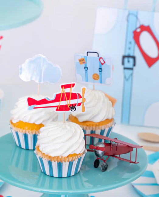 Attention airplane lovers! Featuring airplanes, vintage suitcases and cute clouds, these airplane toppers are heaven.
