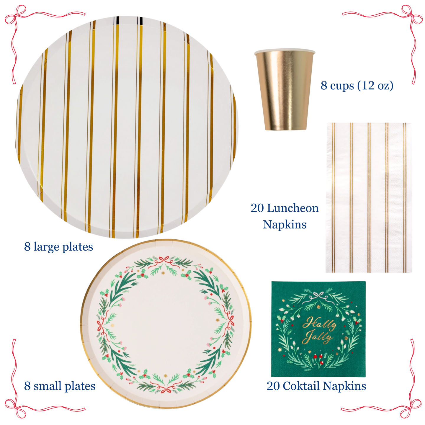 Make your holiday celebration effortless and stylish with our Christmas Party Supplies Box! This coordinated set includes everything you need to create a festive and elegant Christmas tablescape with classic holiday designs and gold accents.