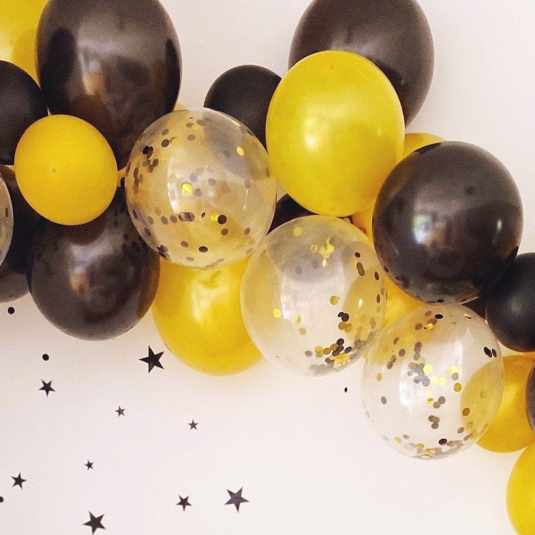 - Black and Gold Confetti Balloon Garland Kit - 40 assorted latex balloons; 1 PCS balloon garland decorating strip measuring 16 feet; 1 PCS double sided dot glue tape (contains 100 dots)