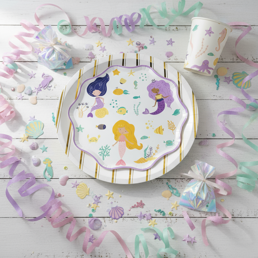 Add whimsy to your celebration with these Mermaid 9oz Paper Cups! Featuring mermaids, seahorses, crabs, octopuses, shells, and ocean plants in pastel purples, pinks, turquoise, and yellow, they bring a magical underwater vibe to any party.