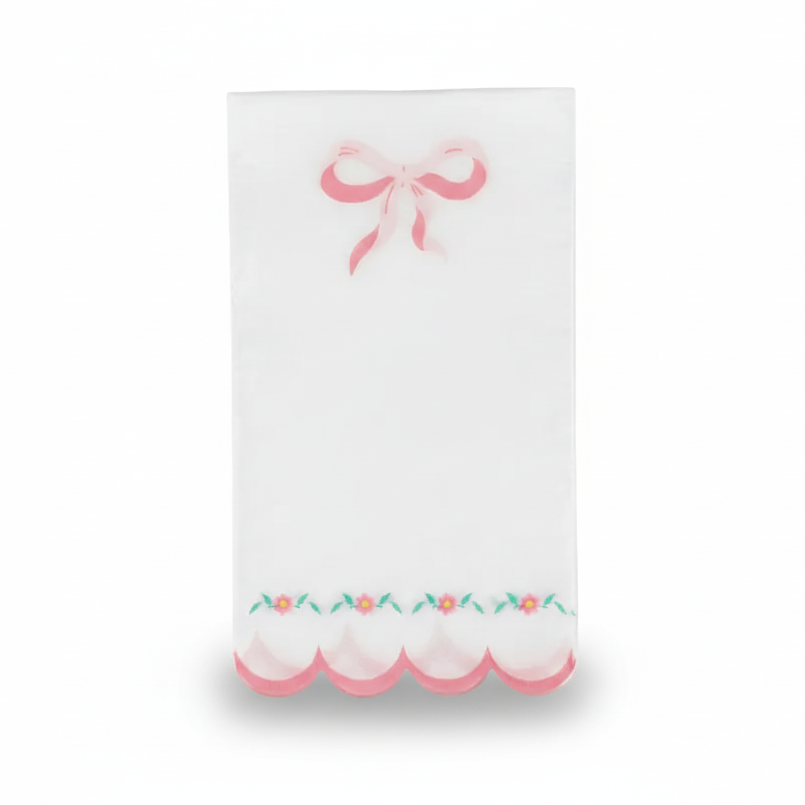 Add charm and elegance to your celebration with our Pink Bow Scalloped Luncheon Napkins. Featuring delicate bows, tiny floral accents, and a soft pink scalloped trim, these napkins bring a sweet, coquette-inspired touch to any tablescape.