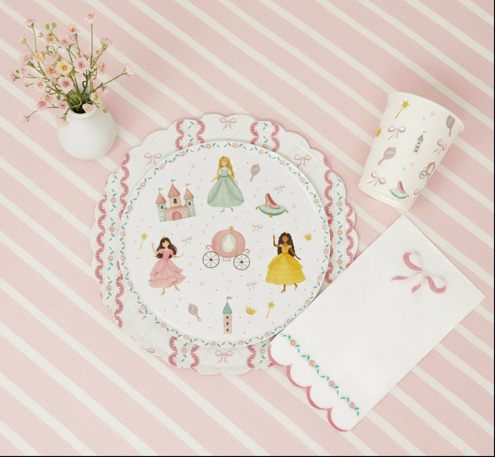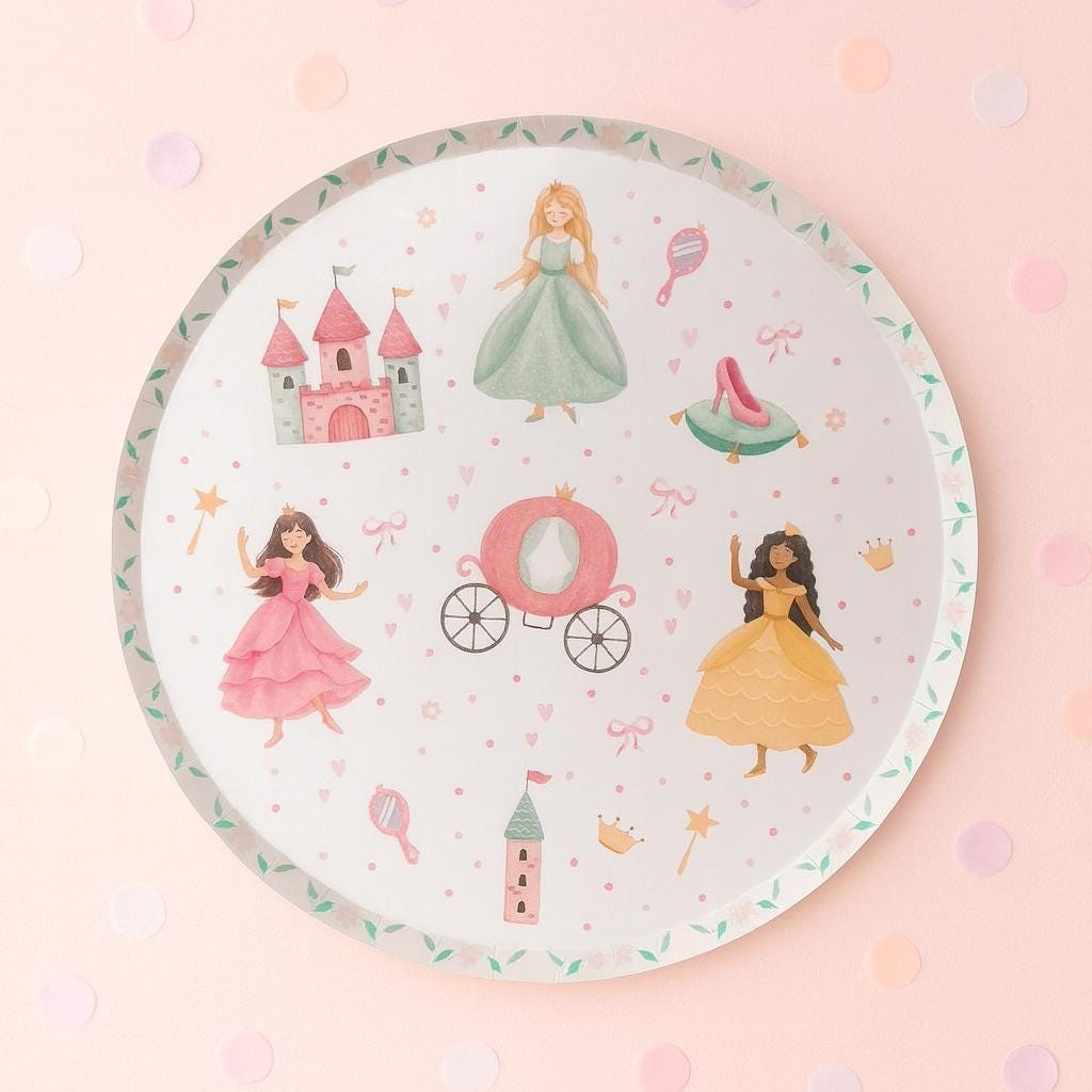 Magical princess party plates featuring castles, carriages, and princesses—perfect for birthdays, tea parties, and whimsical celebrations. Sturdy, eco-friendly, and beautifully designed for an effortless fairytale table.
