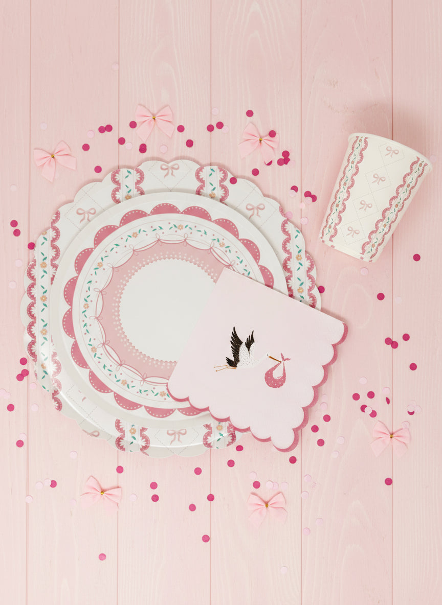 Celebrate your little one in style with these charming scalloped cocktail napkins featuring an adorable stork carrying a baby. Designed in soft pink or blue with elegant scalloped edges, these napkins are the perfect addition to any baby shower, gender reveal, christening, or baptism celebration.