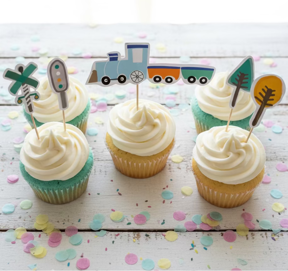 Steam Train coming through! All aboard! Featuring colorful trees, railroad signs and a steam train, these toppers will make your train party the most stylish.